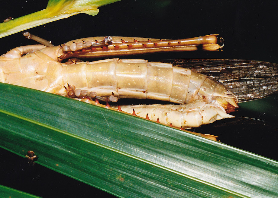 Members in this Suborder have very long antennae, some may be several times of their body length. The auditory organs located on the fore legs. Their stridulation are produced by the mechanisms on the base of their forewings. The females usually have long ovipositors extended from the end of their abdomen.